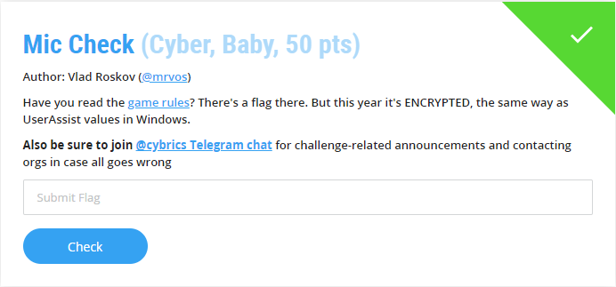 cybrics{An5WEr_t0_T3h_M1C_Ch3CK}