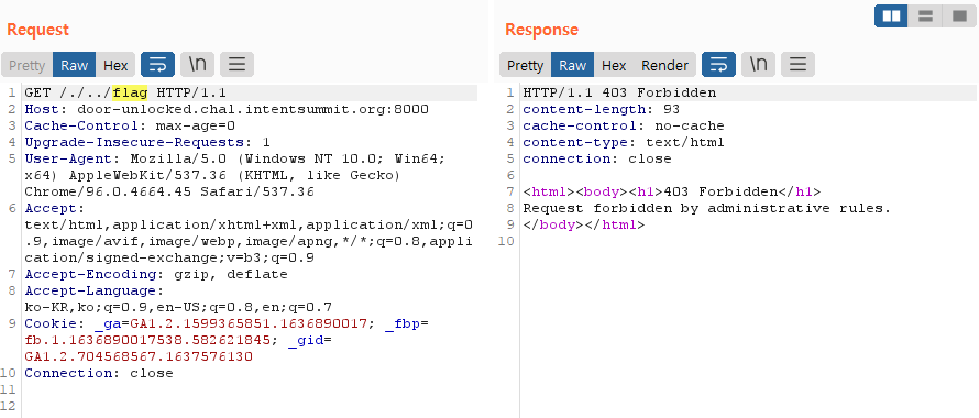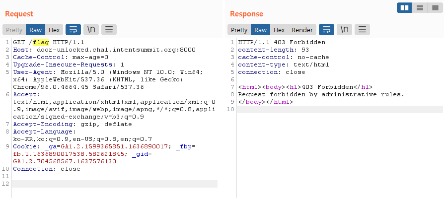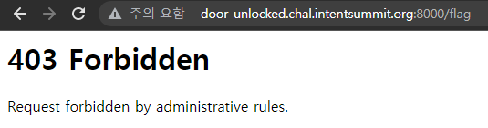 /flag로 접속할경우 보안 정책에 의해 403 Forbidden이 Response 값으로 나오게 됩니다.