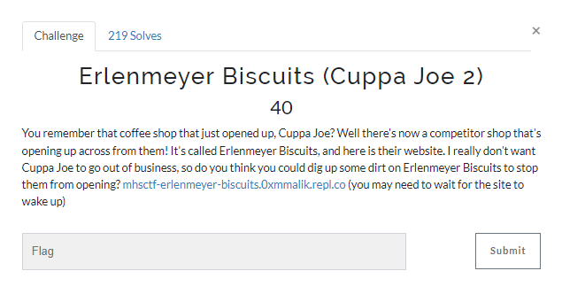 You remember that coffee shop that just opened up, Cuppa Joe? Well there's now a competitor shop that's opening up across from them! It's called Erlenmeyer Biscuits, and here is their website. I really don't want Cuppa Joe to go out of business, so do you think you could dig up some dirt on Erlenmeyer Biscuits to stop them from opening? mhsctf-erlenmeyer-biscuits.0xmmalik.repl.co (you may need to wait for the site to wake up)