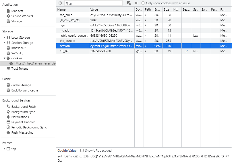 이 페이지의 화면과 소스코드 말고는 다른 정보가 없었기에 우선 cookie 부터 확인해보았습니다.