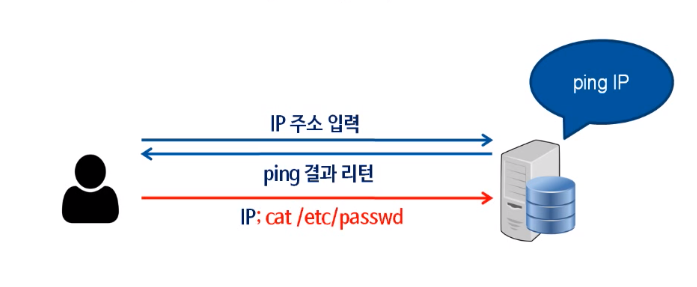 정상적으로 동작하는 서버를 대상으로 공격자가 ;cat /etc/passwd를 요청하는데 이는 ping IP;cat /etc/passwd 형식으로 수행이 된다.