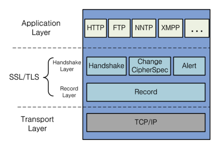 응용계층의 프로토콜들은 외부로 보내는 데이터를 TCP가 아닌 SSL에 보내고 SSL은 받은 데이터를 암호화하여 TCP를 거쳐 외부로 전달합니다.