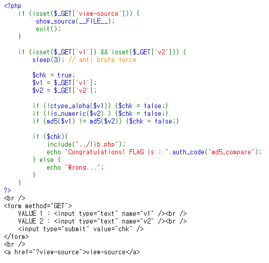 최종적으로 v1과 v2를 md5로 암호화한 값을 비교해서 같을 경우 flag를 알려주는 문제이다.