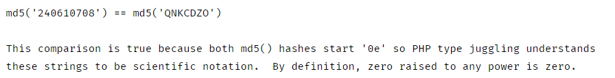 php는 두 md5의 해시 값이 '0e'로 시작하기 때문에 참으로 판단한다고 한다. 참 어이가 없다.