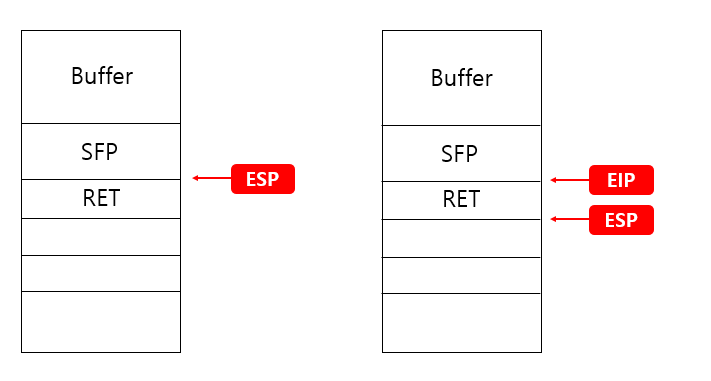 (stack pointer는 ret가 실행되기전 leave명령어의 pop ebp가 실행된 후 RET+4를 가리킨다.)